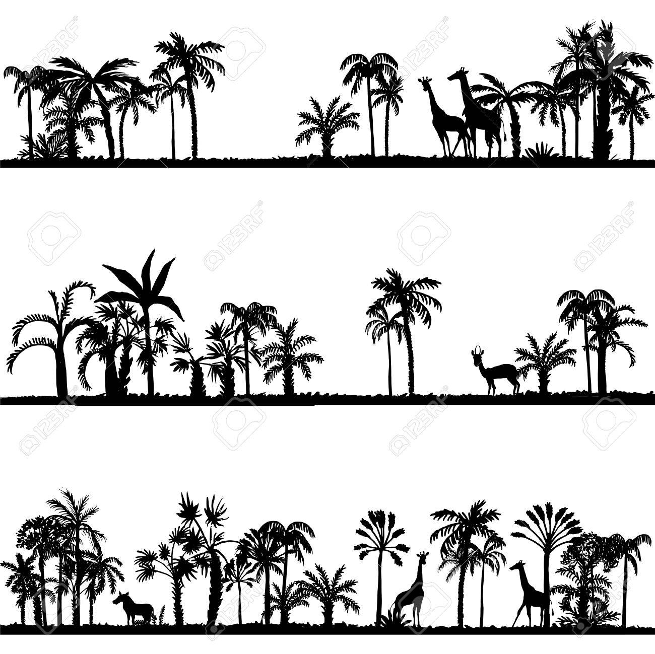 Set Of African Landscapes Palms Silhouettes And Wild Animals