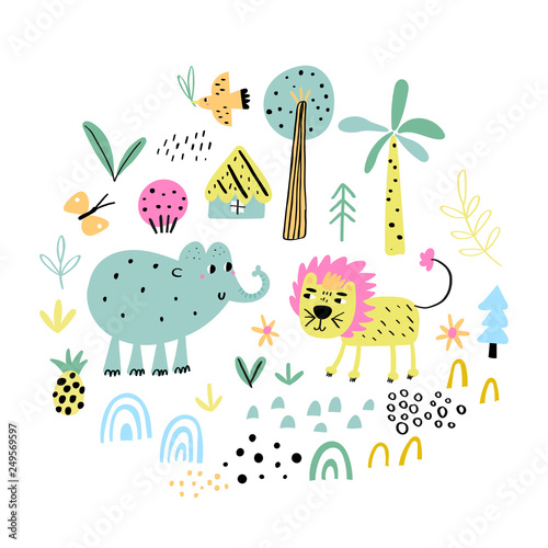 Cute Vector Set Of Children S Drawings Exotic Animals And Plants